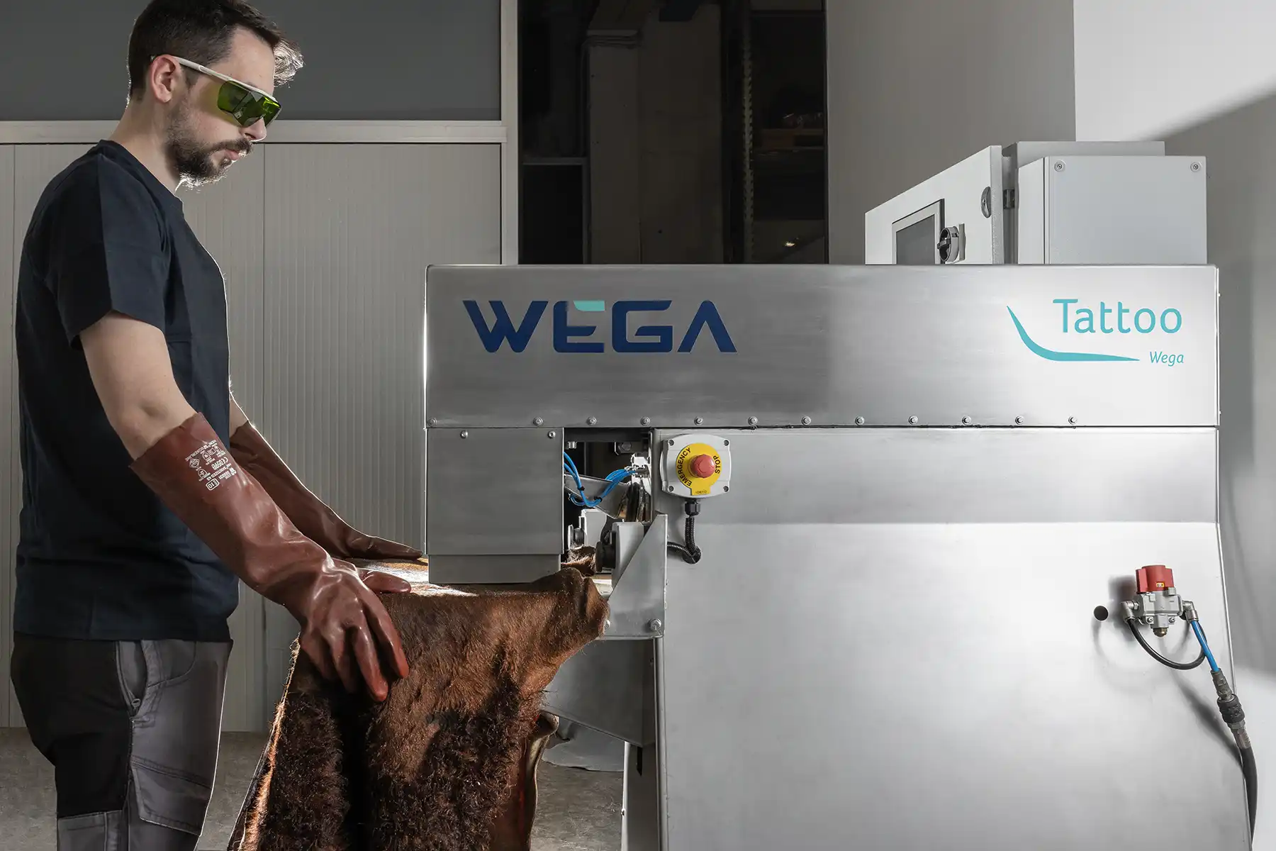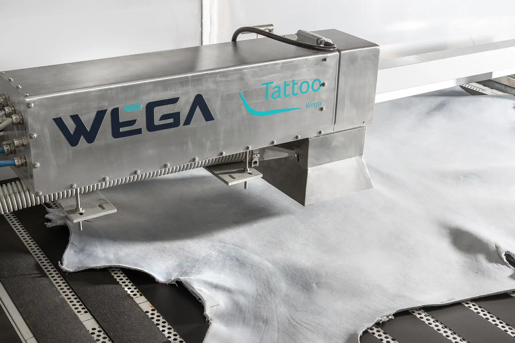 Through Wega Tattoo it is possible to mark a unique code even on moving leather and it will remain unchanged throughout the entire production process from wet leather to finishing, even in case of heavy embossing.